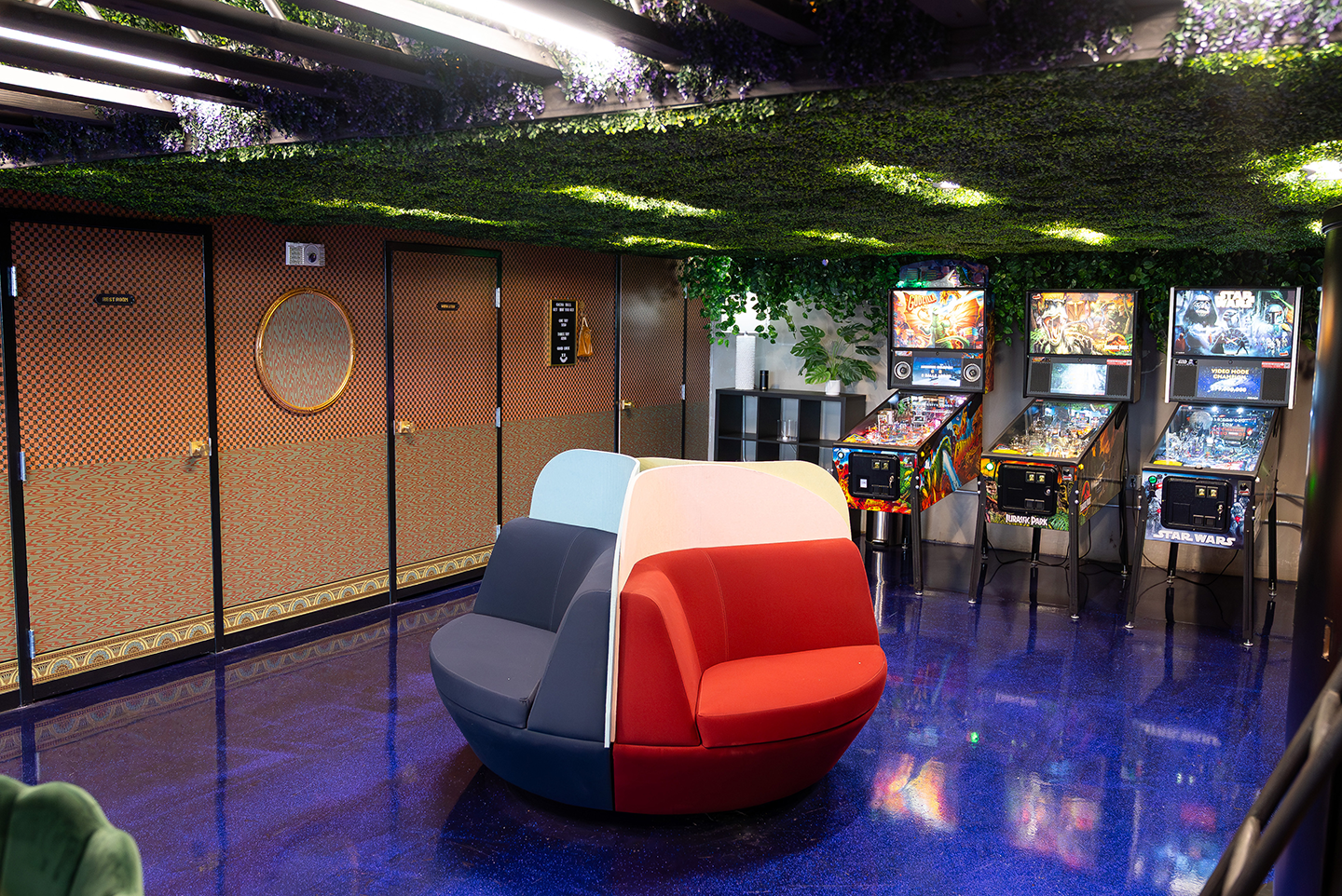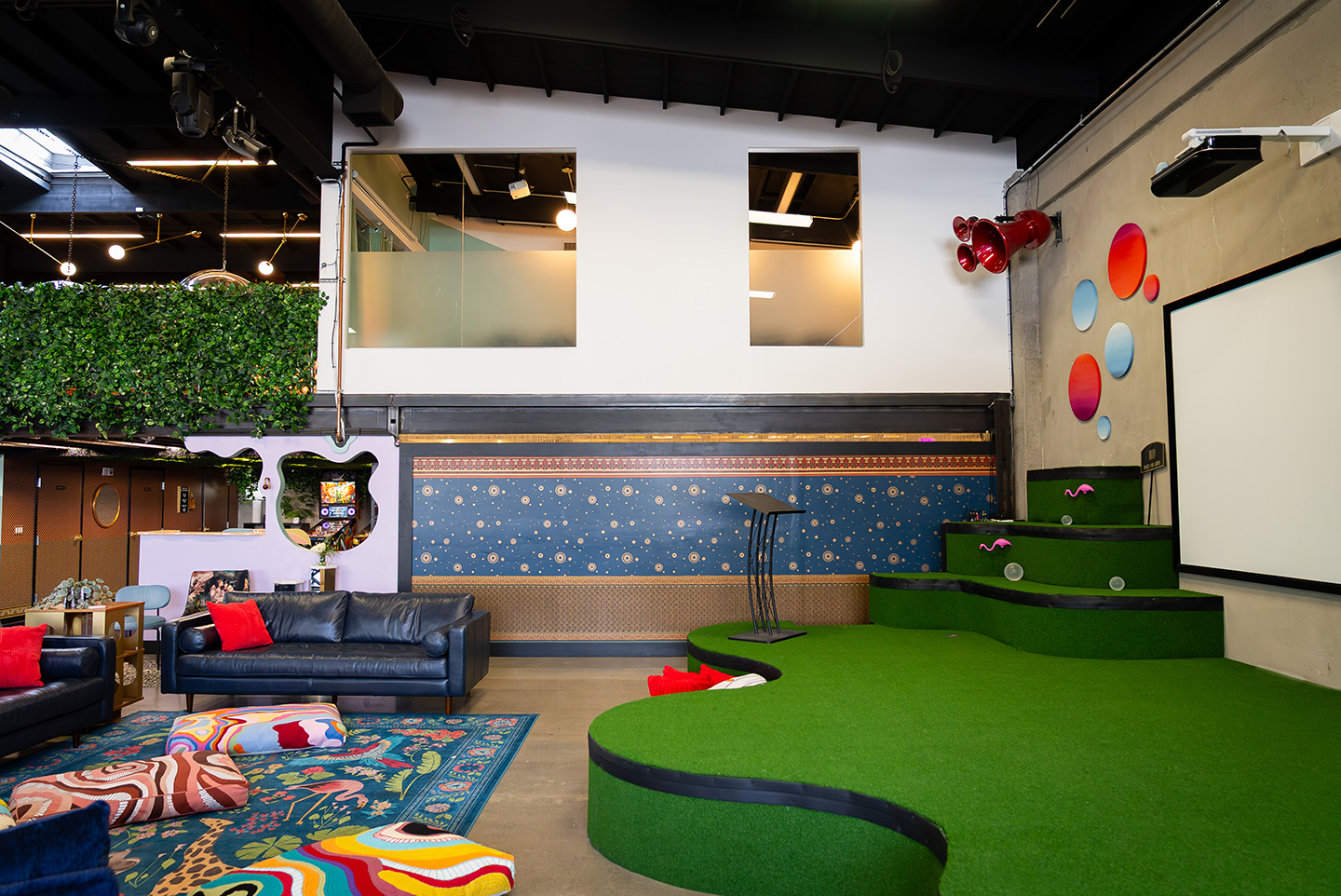 Our creative direction centered on softening the industrial edge of the warehouse while amplifying its sense of play, immersion, and unexpectedness. We leaned into biophilic elements to bring warmth and life into the space — introducing a custom treehouse with swings and a lounge, faux foliage, live plants, and a multi-tiered astroturf-covered stage that merges natural texture with functional performance design.